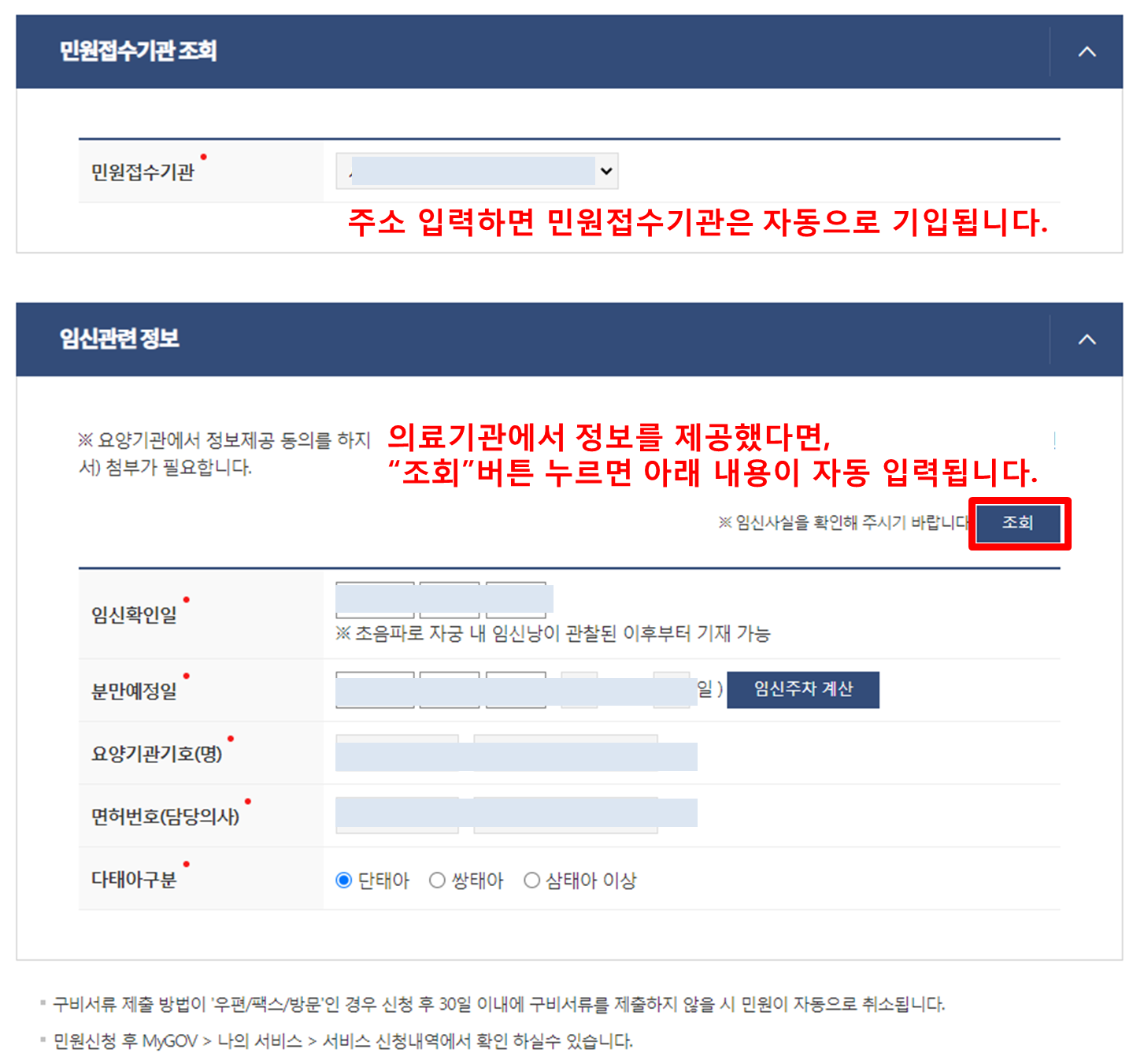임신관련 정보 역시 의료기관에서 정보를 제공했다면 "조회"버튼만으로 내용이 자동입력됩니다^^ 참 좋은 세상이지요.