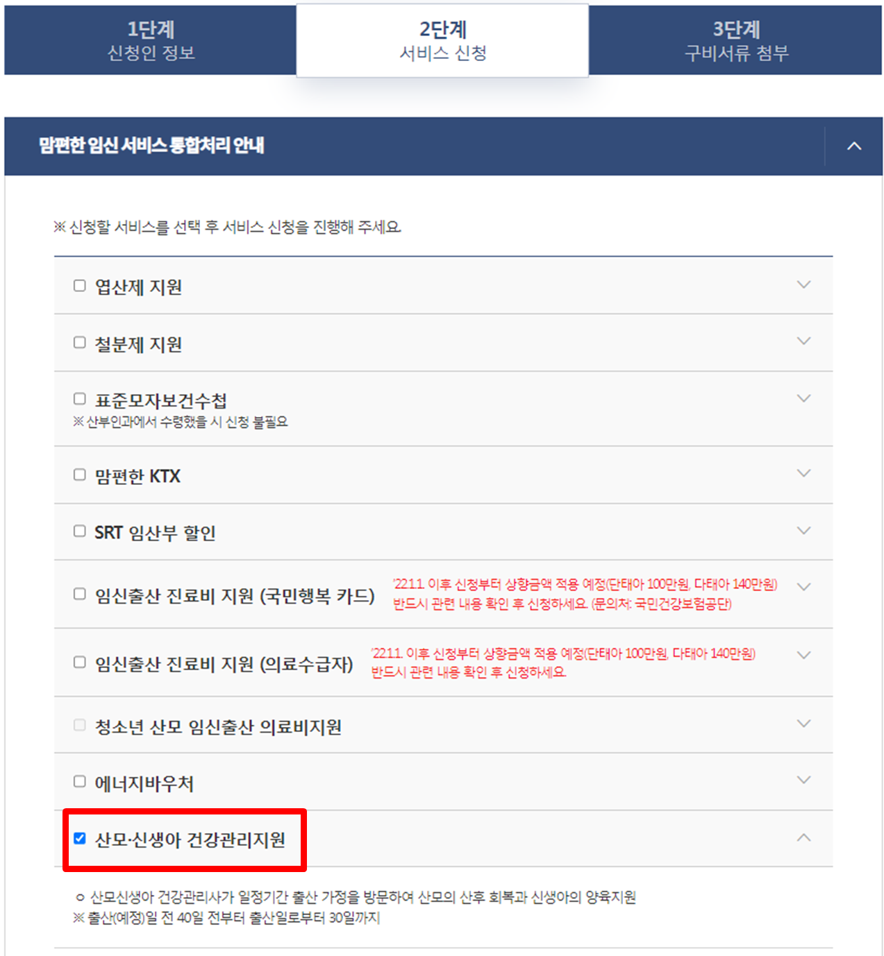 신청할 서비스를 선택해줍니다. 참고로 이건 정부 통합 서비스 신청이라, 지자체 서비스인 서울시 임산부 교통비지원 서비스는 이 선택지에 없습니다. 저는 하는 김에 정부지원 산후도우미 서비스도 함께 신청했습니다^^ 여러분도 필요한 서비스가 있다면 이 참에 한번에 신청하셔요~