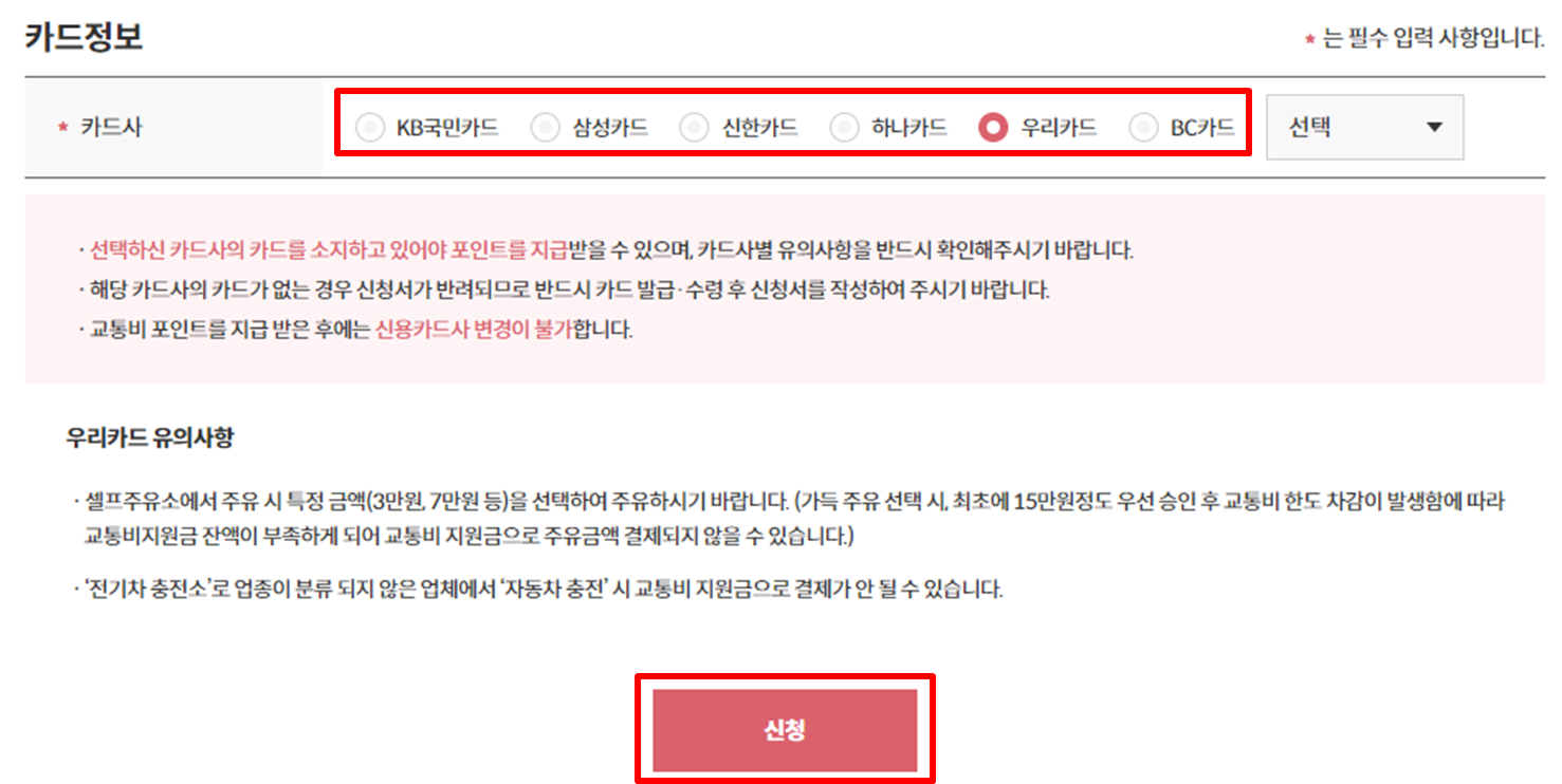 신청일 기준, 아래 카드사의 본인 명의 카드를 소지하고 있어야 신청이 가능합니다.